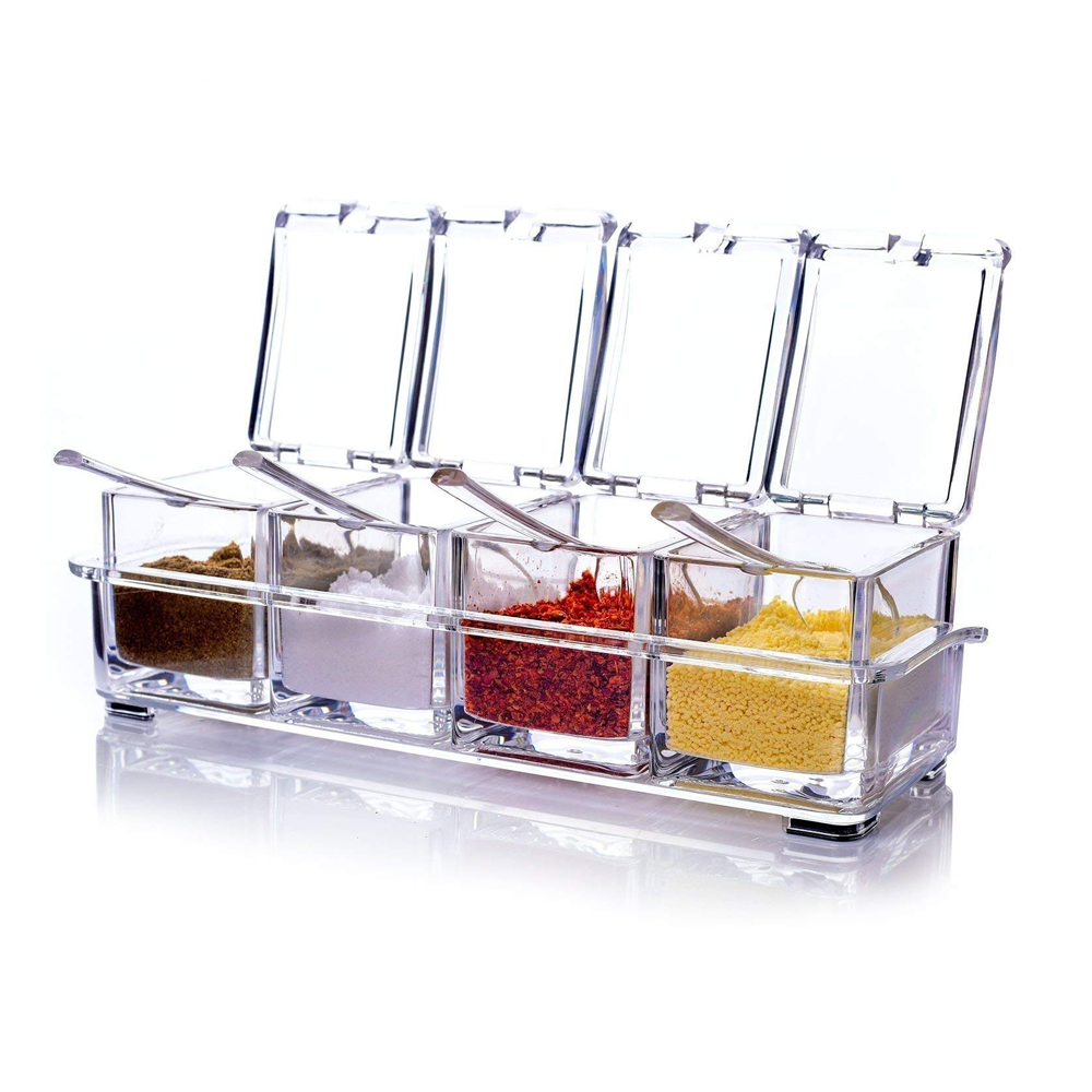Perfecto para mantener tus especias y condimentos en orden. Incluye 4 tarros acrílicos con tapas y soporte compacto: el tamaño ideal para tus necesidades.