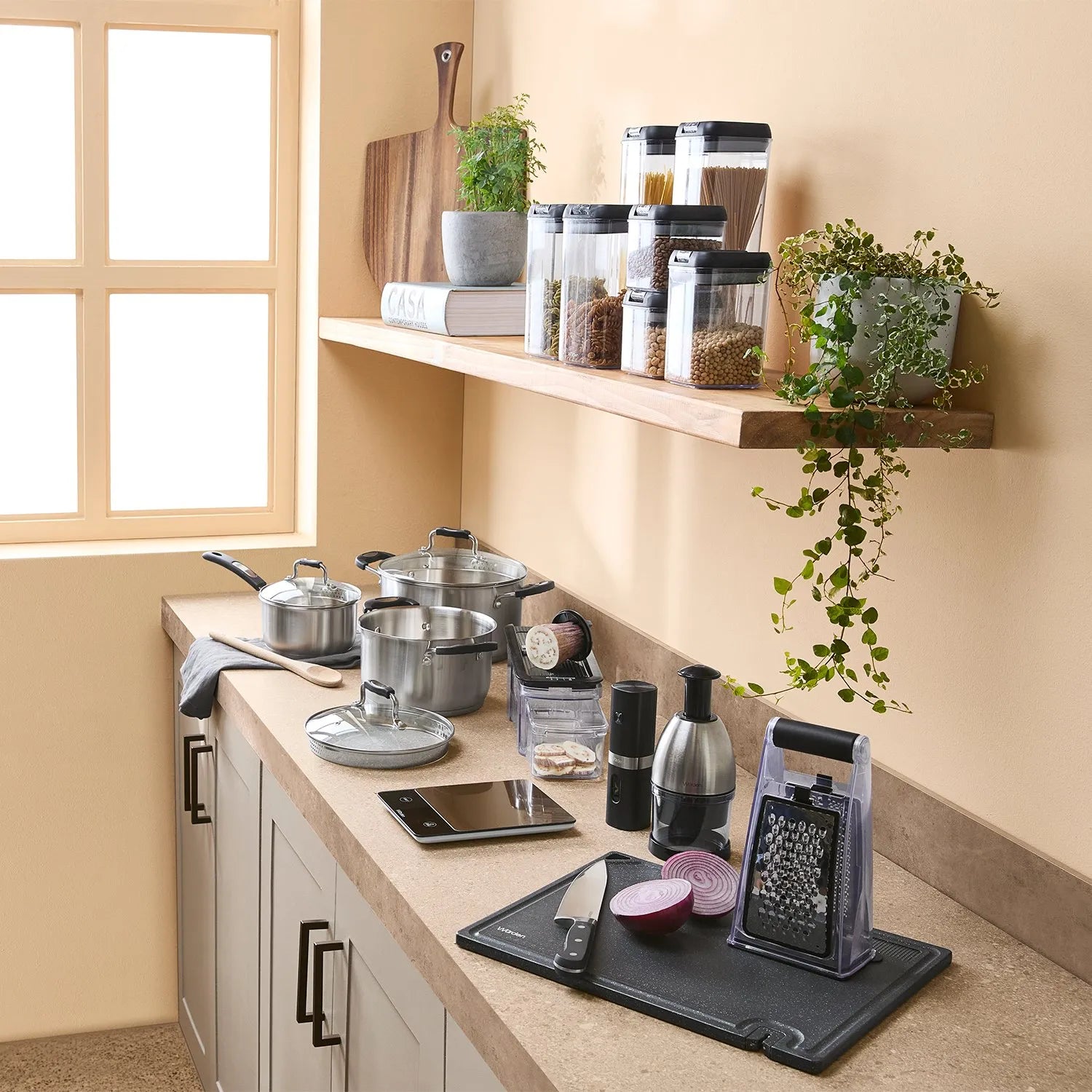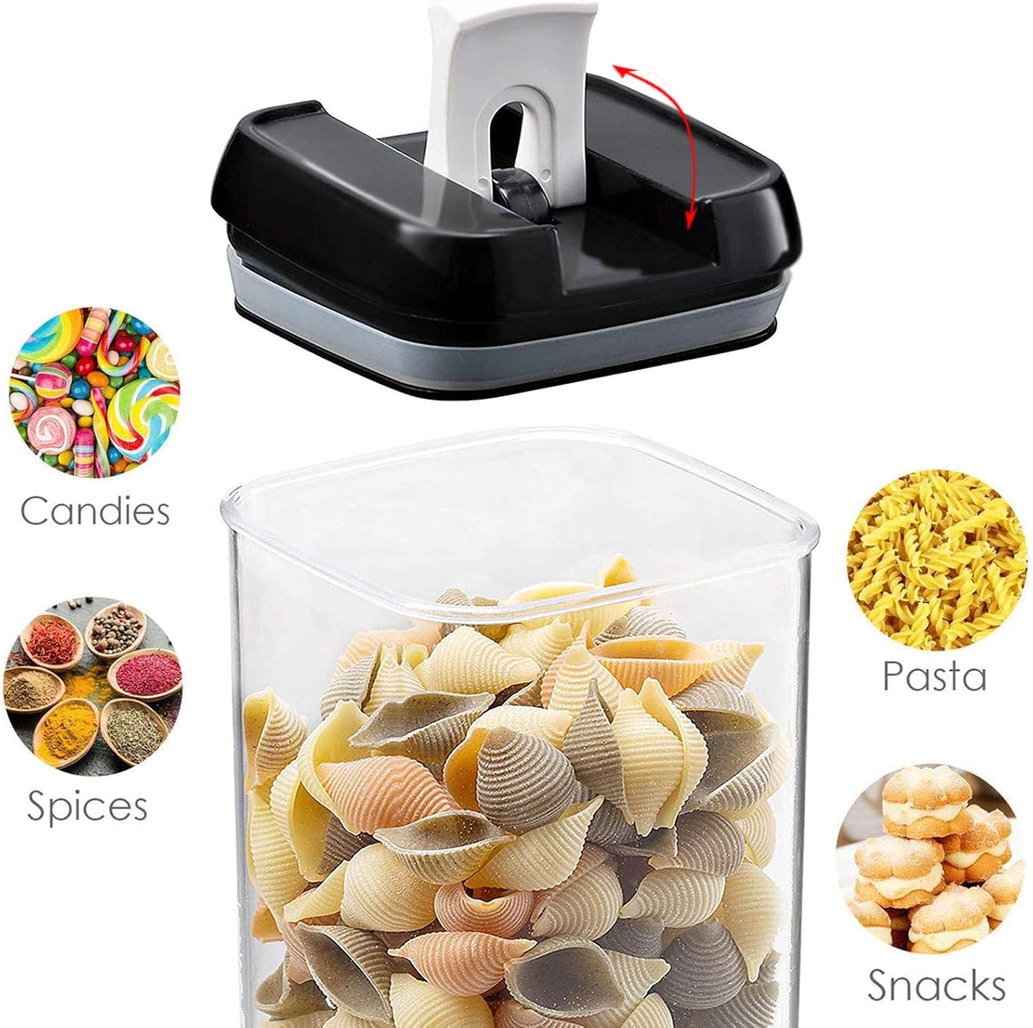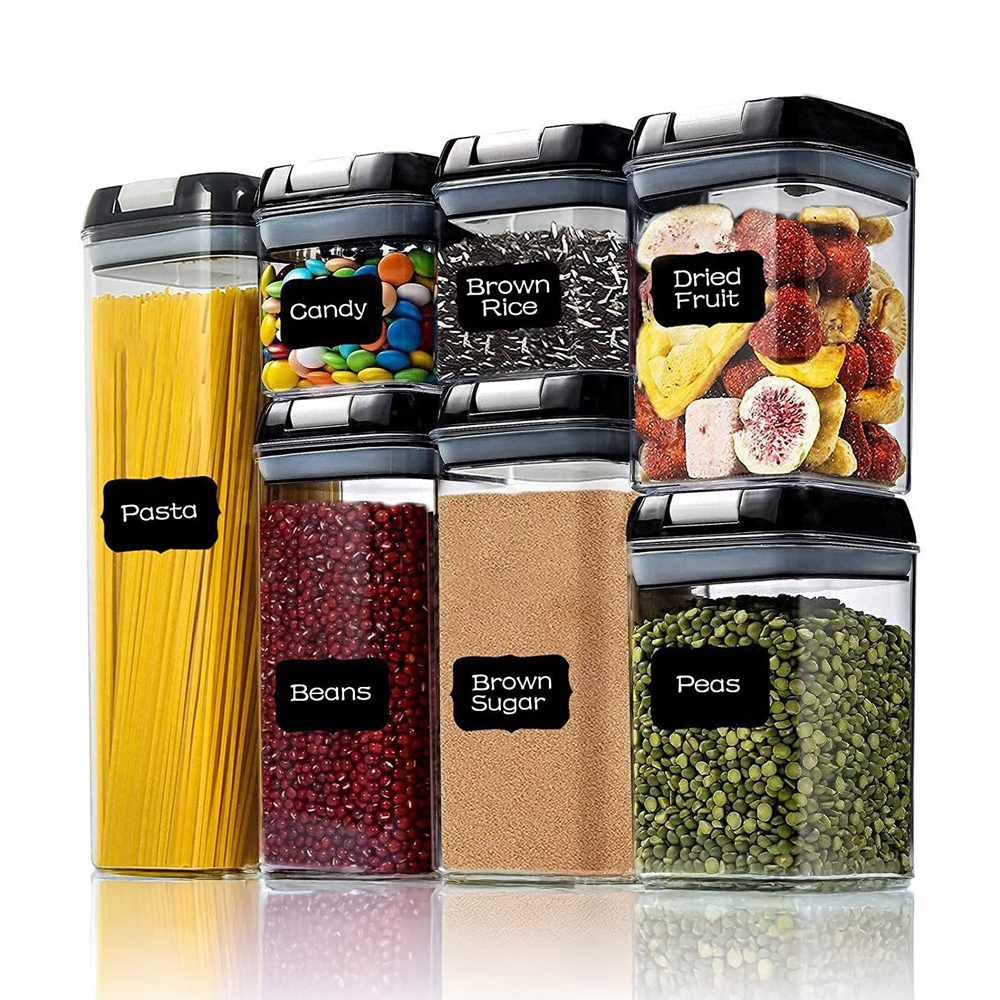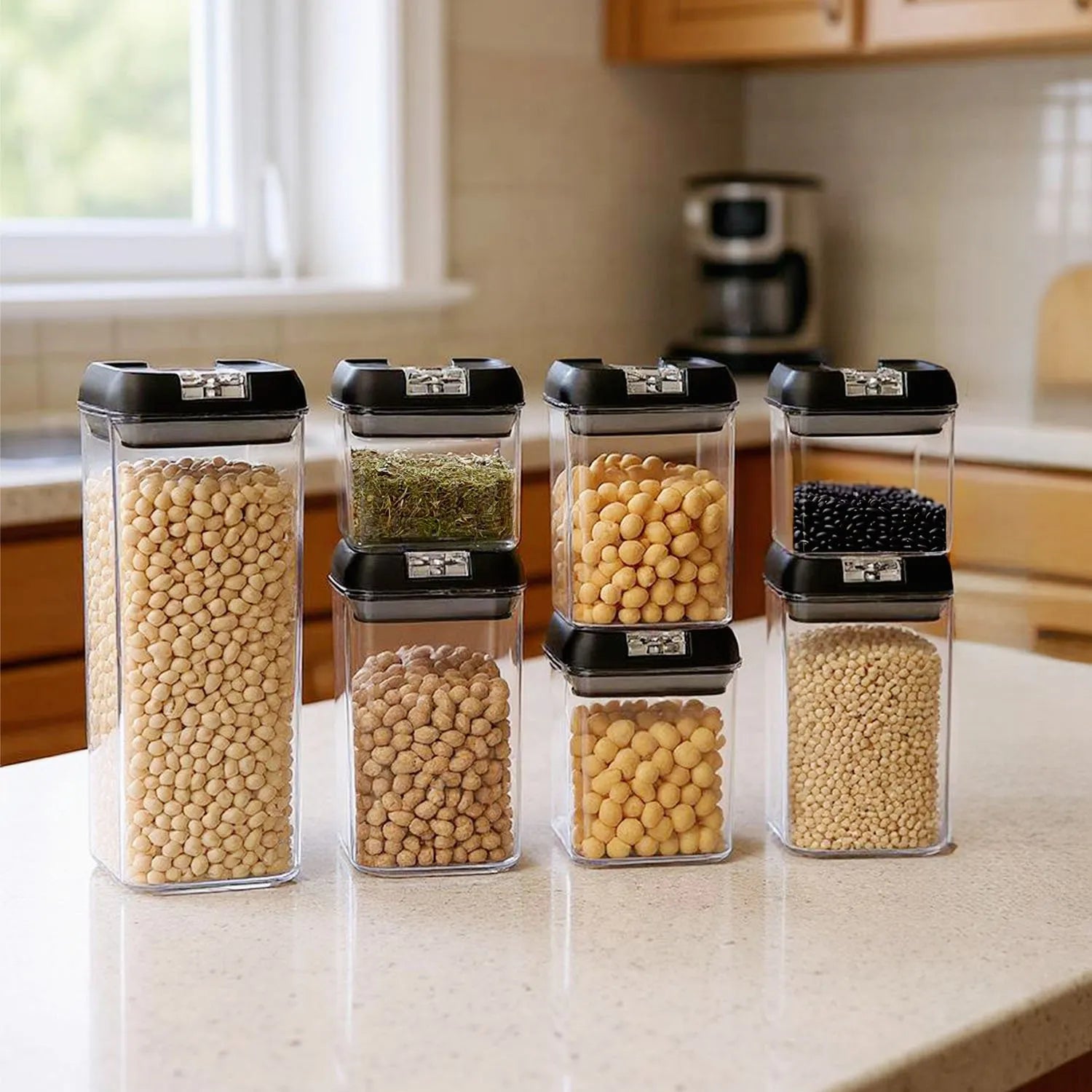 Contenedores con cierre hermético (anillo de silicona + hebilla), diseño apilable y cuerpo transparente para encontrar todo de un vistazo. Plástico de grado alimenticio sin BPA.